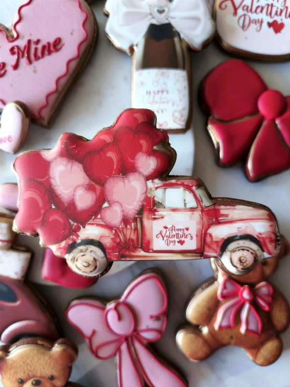 Pierniczek lukrowany auto pick up z balonami serca walentynkowe