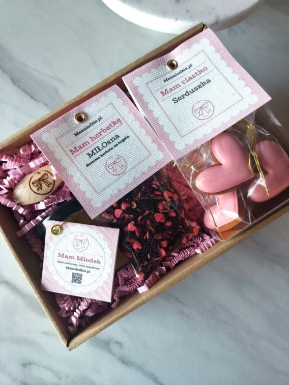 • Pierniczek lukrowany zestaw Serduszka różowe miodek i herbatka