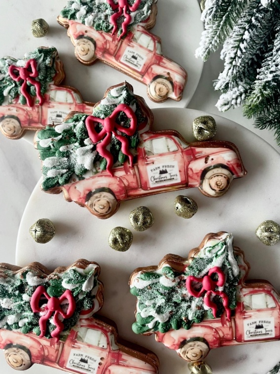 Pierniczek świąteczny pick up czerwone auto z choinką i kokardą 3D